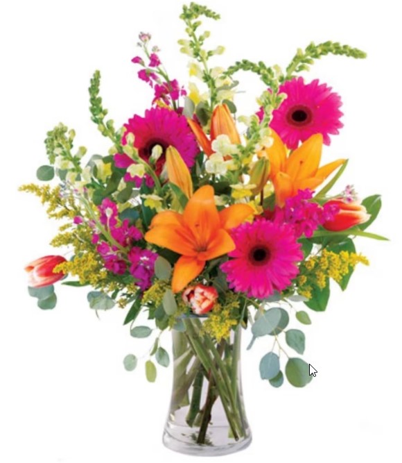 Clear Gathering Vase, Greens: Silver Dollar Eucalyptus, Salal, Flowers: Yellow Snapdragons, Purple Stock, Red Tulips, Hot Pink Gerberas, Solidago, Orange Lilies.