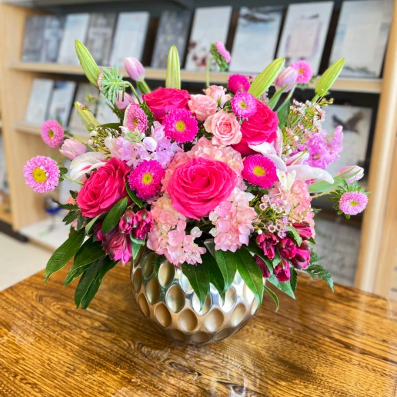 round Vase, Salal, Pink Alstroemeria , Soft Pink stocks, Pink Hydrangea , Pink Lilies , Hot Pink Roses, Light Pink Roses, matsumoto aster, Pink Tulips .